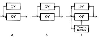 Рисунок: управление социально-экономической системой:а — жесткое управление; б — регулирование с помощью обратных связей; в — саморегулирование (самоуправление); БУ — блок управления; ОУ — объект управления.