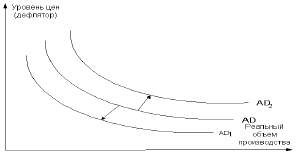 Совокупный спрос представляет собой сумму всех расходов на конечные товары и услуги, произведенные в экономике. Он отражает связь между объемом совокупного выпуска, на который предъявлен спрос экономическими агентами и общим уровнем цен в экономике. В структуре совокупного спроса можно выделить: 1) спрос на потребительские товары и услуги (С); 2) спрос на инвестиционные товары и услуги (Ig); 3) спрос на товары и услуги со стороны государства (G); 4) спрос на чистый экспорт (Xn). Одни компоненты совокупного спроса, например потребительские расходы, относительно стабильны, изменяются медленно, более динамичны, другие, например инвестиционные расходы – их изменения вызывают колебания экономической активности. Совокупный спрос равен объему национального производства: ВНП = С + Ig + G + Хn. Кривая совокупного спроса АD (от англ. aggregate demand) показывает различные объемы товаров и услуг (реальный ВНП), которые потребители, фирмы и государство готовы купить при любом возможном уровне цен (рис. ниже). На оси абсцисс указываются значения реального объема производства (реального ВНП), а на оси ординат – не абсолютные показатели цен (например, в млрд р.), а уровень цен или индекс- дефлятор ВНП.