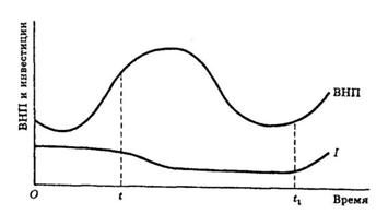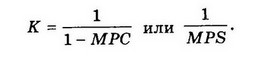 Допустим, например, что некая фирма удовлетворяет существующий спрос на свою продукцию, используя 10 машин, одна из которых ежегодно заменяется новой. Если спрос возрастает на 20%, фирма должна закупить две новые машины (в дополнение к одной машине, идущей на замещение), чтобы удовлетворить этот спрос. Таким образом, инвестиции частично являются функцией от изменения уровня дохода: I = f(∆Y). Рост индуцированных инвестиций, в свою очередь, приводит к усилению эффекта мультипликаторав увеличении национального дохода. Объединённый эффект акселератора и мультипликатора, проявляющийся в инвестиционном цикле, предлагается в качестве объяснения изменений уровня экономической активности, связанных с деловымциклом. Поскольку объём инвестиций зависит от темпа изменения валового национального продукта, быстрый рост ВНП приводит к большому объёму инвестиций, когда производители стремятся увеличить свои производственные мощности (момент t на рис. 2). Столь высокий уровень инвестиций увеличивает совокупный спроси помогает поддерживать высокий уровень ВНП. Однако по мере удаления от момента времени t темпы роста ВНП замедляются, бизнесменам больше нет необходимости столь быстро наращивать мощности и инвестиции начинают сокращаться до уровня инвестиций на замещение. Снижение инвестиций приводит к падению совокупного спроса и вызывает в конце концов уменьшение ВНП.Поскольку ВНП в течение некоторого времени удерживается на низком уровне, машины начинают изнашиваться, и у бизнесменов, если они хотят поддерживать производственные мощности на уровне, достаточном, чтобы удовлетворять хотя бы сократившийся совокупный спрос, появляется необходимость заменить часть этих машин. Такое увеличение объёма инвестиций в момент t1 повышает совокупный спрос и стимулирует рост ВНП. Подобно инвестициямв основной капитал, инвестиции в оборотный капитал до некоторой степени являются функцией от темпа изменения дохода, так что инвестиции в запасыподвержены аналогичному эффекту акселератора. МУЛЬТИПЛИКАТОР (multiplier) — отношение изменения равновесного уровня национального доходаквызвавшему его исходному изменению уровня расходов. Мультипликационный эффект отражает следующие явления: некоторое исходное увеличение или уменьшение уровня совокупных расходов влечёт за собой большее увеличение или уменьшение национального дохода. Необходимо отметить две основные черты мультипликатора: (а) это кумулятивный процесс, а не мгновенный эффект, лучше всего его можно объяснить серией последовательных шагов прироста дохода; (б) величина мультипликатора зависит от доли прироста дохода, расходуемой на потребление (предельная склонность к потреблению, МРС) на каждом последующем шаге. Предположим, что весь доход частью потребляется, частью изымается в виде сбережений (т. е. МРС и максимальная склонность к сбережению, MPS, в сумме равны единице). Тогда величина мультипликатора (К) выражается формулой