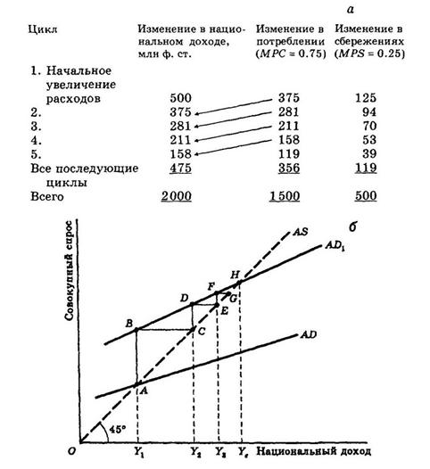 Рис. 73. Мультипликатор. а. Мультипликационный процесс. б. Эффект мультипликатора при увеличивающихся расходах национального дохода. Мультипликационный эффект проиллюстрирован на рис. 736. При значении мультипликатора, равном 4, исходный прирост совокупных расходов 500 млн ф. ст. вызовет увеличение национального дохода на 2 млрд ф. ст., как видно из рис. 73а. На каждом шаге часть созданного дополнительного дохода сберегается и поэтому «утекает» из кругооборота. Эти средства не могут выступить в качестве дополнительных расходов на потребление на следующем шаге. Когда накопленная сумма этих утечек в форме сбережений становится равной начальному увеличению расходов, мультипликационный процесс прекращается и экономика достигает нового состояния равновесия. На рис. 736 показано действие мультипликационного эффекта. При исходном уровне национального дохода OY 1, если совокупный спросвозрастает с AD доAD 1 ; исходное увеличение расходов АВ повлечёт за собой рост объёма выпуска и национального дохода с Y1 до Y 2. Этот дополнительный доход должен вызвать дальнейшее увеличение расходов (CD), которое, в свою очередь, поднимает объём выпуска и уровень национального дохода с Y2 до Y3. Этот дополнительный доход также вызовет рост совокупных расходов (EF), который, в свою очередь, поднимет объём выпуска и уровень национального дохода, и т. д. Процесс заканчивается при достижении нового равновесного уровня национального дохода Ye. Кроме сбережений, изымаемых из кругооборота доходов, существуют также «утечки» в виде налогообложения и импорта, которые ещё более сокращают величину мультипликатора. Поэтому более точной формулой последнего будет следующая: