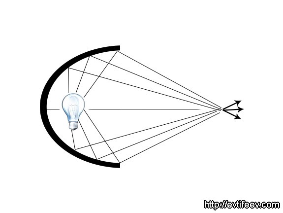 форма эллипса (приложил один рефлектор к другому и наложил сверху эллипс) Плюс эллиптических рефлекторов в том, что они очень эффективны в создании яркого светового пятна. Но пятно это получается неоднородное, с некоторой обводкой пятна в зависимости от места фокусировки, т.к. лучи сходящиеся, а не параллельные, как у сферического и параболического отражателей.