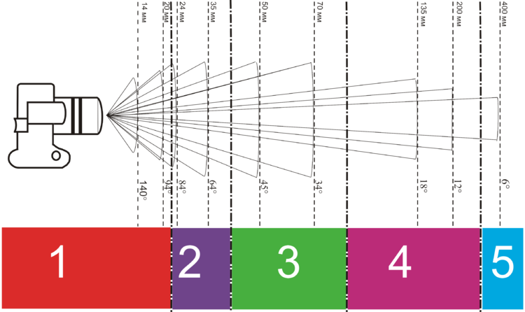 Схематическое обозначение фокусного расстояния и их угол поля зрения: 1.Сверхширокоугольный объектив. 2.Широкоугольный объектив. 3. Нормальный объектив. 4. Телеобъектив. 5. Супер-телеобъектив