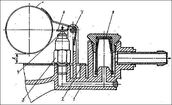 Рис. 3. Конструкция механизма поддержания постоянного уровня топлива: 1. Крышка карбюратора; 2. Прокладка; 3. Корпус клапана; 4. Игла клапана; 5. Поплавок; 6. Язычок; 7. Ось поплавка; 8. Фильтрующий элемент