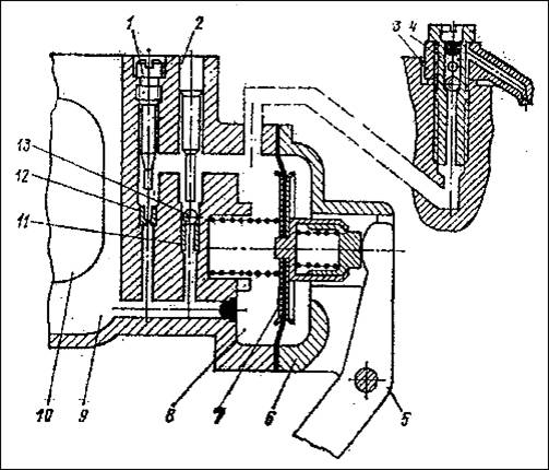 Винт регулировки подачи бензина; 2. Пробка обратного клапана; 3. Топливный жиклер; 4. Клапан распылителя; 5. Рычаг; 6. Крышка ускорительного насоса; 7. Диафрагма; 8. Полость; 9. Поплавковая камера; 10. Поплавок; 11. Втулка обратного клапана; 12. Перепускной жиклер; 13. Шарик обратного клапана