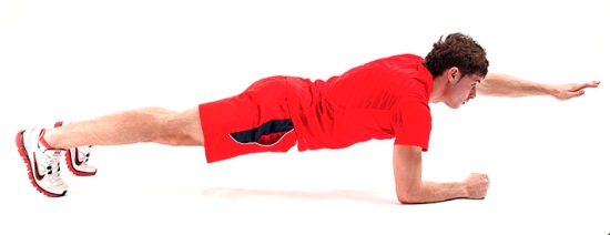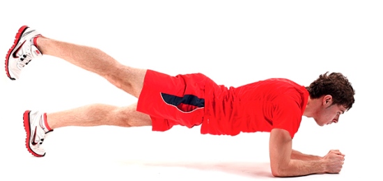 Как делать: встаньте на локти, как при выполнении обычной планки. Втяните живот, сделайте поясницу плоской. Не изменяя положения корпуса, поднимите одну ногу вверх чуть выше плеч, сохраняя её прямой. Пальцы поднятой ноги тянем на себя.Задержитесь в этом положении столько, сколько сможете. Отдохните, а затем повторите с другой ногой. Когда делать: можете простоять в обычной планке минуту — переходите к этому варианту. Очень важно, чтобы поясница не прогибалась. Мышцы пресса и ягодиц, должны находиться в постоянном напряжении, при этом живот должен быть втянут, что обеспечивает правильное положение таза, поджимая копчик внутрь и удерживая корпус параллельно полу. Если техника ломается, остановитесь, отдохните несколько минут, и повторите снова.