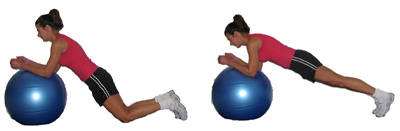 В. Задержитесь в получившейся позе планки в течение 1-2 секунд, опустите колени, слегка коснувшись пола прежде, чем опять вернуться в позу планки. Вариант упражнения Планка на фитболе. Положите ноги на мяч так, чтобы опора пришлась на голени. Ладони при этом должны располагаться на полу строго под плечами и на их ширине.