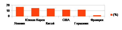 Не смотря на не такие большие объемы производства у Японии по сравнению с Китаем и Кореей (в 2 раза меньше, чем у Кореи и в 3 раза меньше, чем у Китая), данная отрасль «кормит» около 400000 японцев. Примерно 100000 занято непосредственно на верфях, а еще 300000 обеспечивают деятельность дочерних и сопутствующих предприятий, поскольку используется только отечественное оборудование. В связи с постоянным развитием научно — технического прогресса, немалый интерес для современного мира представляет японская отрасль роботостроения. Как известно, данная страна занимает лидирующие позиции, постоянно совершенствуясь в данном секторе промышленности (рис. 6) [3].