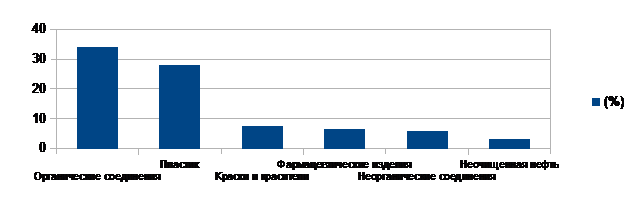 Рис. 4. Мировой рынок роботостроения Согласно данным диаграммы, Япония обладает максимальной долей на рынке роботостроения. Однако Китай в ближайшие 5 — 10 лет планирует увеличить производство данного типа продукции и занять лидирующую позицию в мире вместо Японии. Необходимо отметить, что в Японии занимаются производством роботов более 300 компаний. При этом она занимается разработкой военной, промышленной и медицинской робототехники. Не менее важной отраслью развития экономики Японии является химическая промышленность, которая занимает одно из лидирующих мест среди стран в мире по объему производства. В данном секторе экономике насчитывается более 5224 предприятий, на которых занято 388 000 человек. К крупнейшим производителям в области химической промышленности необходимо отнести следующие японские компании (таблица 5): Продукты, произведенные в данной отрасли в процентном соотношении представляют следующую структуру (рис. 5) Таблица 5. Крупнейшие производители химической промышленности (2013 г.)