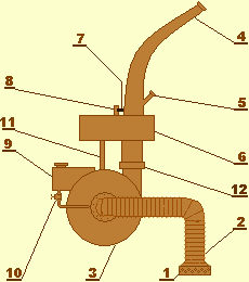 Принцип работы. МТА устанавливают вдоль канала на дороге. Опускают заправочный рукав с фильтром(1) в канал. Для заполнения насоса(2) водой используют эжекционное устройство(8). Оно необходимо, чтобы центробежный насос заполнить водой, так как при нахождении воздуха в насосе не создается разряжения, и вода не будет подниматься из канала. Эжектор установлен на выхлопной трубе трактора, всасывающий патрубок соединяется с насосом. При пуске двигателя эжектор создает в насосе вакуум, за счет которого вода заполняет внутреннюю полость насоса. Когда насос заполнится, вода в виде капель будет вылетать из трубы. В этот момент тракторист включает центробежный насос и отключает эжекционное устройство. Когда из сопел пойдет вода, отключает эжекционное устройство и начинает движение. Насос засасывает воду из канала и под давлением подает в сопла, вода вылетает из сопел под углом 45° к горизонту, для наибольшей дальности. При полете струя разбивается на капли, за счет трения о воздух и силы тяжести. Малое сопло орошает ближний радиус, а большое сопло дальний, благодаря чему весь сектор орошается равномерно. Для подкормки растений открывают кран бака подкормщика, раствор удобрений засасывается насосом, перемешивается с водой и подается на поле.При работе редуктор(6) поворачивает сопла. Чтобы сопла поворачивались при неподвижном напорном патрубке насоса установлена муфта(12). При повороте сопел, упор подходит к переключателю реверса(8), переводит его на противоположное направление, вращения сопел. Они начинают поворачиваться в другую сторону, пока второй упор не переведет переключатель. Далее процесс повторяется. Регулировки. 1. Норма полива - скорстью МТА с помощью КПП - чем больше скорость, тем меньше норма внесения. Менять скорость МТА изменением подачи топлива нельзя, так как МТА должен работать с номинальными оборотами, при снижении оборотов двигателя снизятся и обороты насоса, что приведет к уменьшению дальности полета струи. Норма полива задается агрономом или полив производят до появления первых луж.