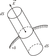 Напряженность электрического поля у поверхности заряженного проводника Рассмотрим поверхность заряженного проводника (рис. 5.3). Для расчета на- пряженности электрического поля у его поверхности воспользуемся теоремой Гаусса. Рассмотрим небольшой цилиндр, образованный нормалями к поверхности проводника и основаниями площадью dS, одно из которых расположено внутри проводника, другое за его пределами.