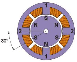 Показанный на рисунке двигатель имеет 3 пары полюсов ротора и 2 пары полюсов статора. Двигатель имеет 2 независимые обмотки, каждая из которых намотана на двух противоположных полюсах статора. Такой двигатель, как и рассмотренный ранее двигатель с переменным магнитным сопротивлением, имеет величину шага 30 град. При включении тока в одной из катушек, ротор стремится занять такое положение, когда разноименные полюса ротора и статора находятся друг напротив друга. Для осуществления непрерывного вращения нужно включать фазы попеременно. На практике двигатели с постоянными магнитами обычно имеют 48 – 24 шага на оборот (угол шага 7.5 – 15 град).