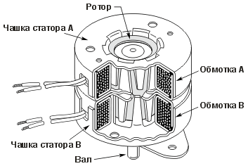 Для удешевления конструкции двигателя магнитопровод статора выполнен в виде штампованного стакана. Внутри находятся полюсные наконечники в виде ламелей. Обмотки фаз размещены на двух разных магнитопроводах, которые установлены друг на друге. Ротор представляет собой цилиндрический многополюсный постоянный магнит.