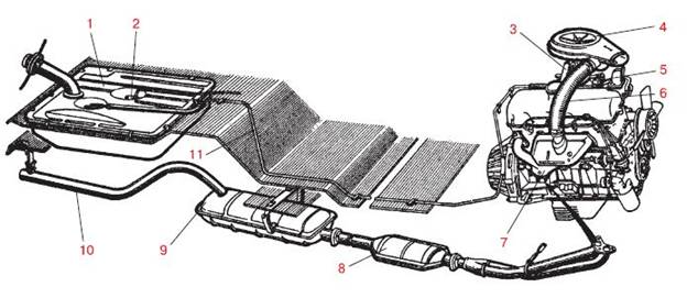 Рис. 2.12. Система питания автомобиля: 1 — топливный бак; 2 — датчик указателя уровня топлива; 3 — карбюратор; 4 — воздушный фильтр; 5 — топливный насос; 6 — шланг подвода нагретого воздуха; 7 — выпускной трубопровод; 8 — дополнительный глушитель; 9 — основной глушитель; 10 — труба глушителя; 11 — топливопровод