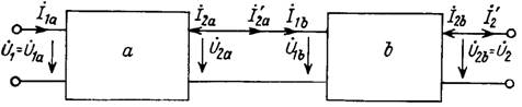А-матрица составного четырехполюсника при каскадном соединении равна произведению А -матриц отдельных четырехполюсников. Так как произведение матриц в общем случае не обладает свойством коммутативности, то и A -параметры каскадного соединения двух четырехполюсников в общем случае зависят от последовательности их включения, так как A a A b ¹ A b A a.