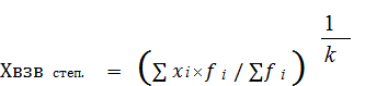 где х0 – нижняя граница интервала; h – величина интервала; fm – частота интервала; f – число членов ряда; ?m- 1 – сумма накопленных членов ряда, предше–ствующих данному. Наряду с медианой для более полной характери–стики структуры изучаемой совокупности применяют и другие значения вариантов, занимающих в ранжи–рованном ряду вполне определенное положение. К ним относятся квартили и децили. Квартили делят ряд по сумме частот на четыре равные части, а деци-ли – на десять равных частей. Квартилей насчитыва–ется три, а децилей – девять. Медиана и мода в отличие от средней арифмети–ческой не погашают индивидуальных различий в зна–чениях варьирующего признака и поэтому являются дополнительными и очень важными характеристика–ми статистической совокупности. На практике они ча–сто используются вместо средней либо наряду с ней. Особенно целесообразно вычислять медиану и моду в тех случаях, когда изучаемая совокупность содер–жит некоторое количество единиц с очень большим или очень малым значением варьирующего признака. Степенные средние величины Степенные средние величины получили свое название по виду функции, используемой для их расчета. Простая степенная средняя величина рассчитывается по формуле где k – показатель степени средней величины. При k = - 1 по данной формуле рассчитывают гармоническую среднюю величину (Х гарм.). Далее при k = 1 находят арифметическую среднюю, при k = 2 - квадратическую, при k = 3 - кубическую, при k = 4 - биквадратическую и т.д. Если одно и то же значение признака встречается несколько раз, рассчитывают взвешенную среднюю величину: