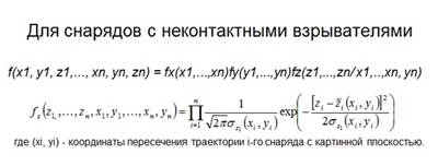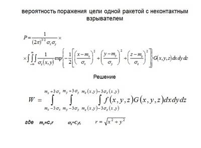 Воспользуемся формулой Колмогорова (пример применения формулы полной вероятности): W = \sum_{i=1}^n P_{m,n} G(m), где W - искомая вероятность, P_{m,n} - вероятность попадания в цель ровно m ударных снарядов из n запущенных, G(m) - вероятность поражения цели при попадании в нее ровно m снарядов. В данной формуле используется вероятность попадания снаряда в цель. Посчитаем ее в виде двухмерного интеграла: P = \int_{C} f(x, y) dxdy, где C - область проекции цели на плоскость рассеивания вдоль линий направления стрельбы, f(x, y) - закон рассеивания. Определить теперь P_{m, n} в предположении независимости выстрелов можно, очевидно, по формуле P_{m, n} = C_n^m * P^m * (1 - P)^(n - m).