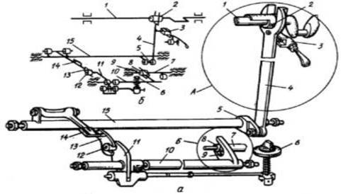В швейной машине к узлу горизонтального перемещения (рис. 2) относится вал продвижения 15. Коромысло вала 5, соединенное с нижней головкой шатуна-вилки 4, получает движение от главного вала 1 через эксцентрик 2. При вращении главного вала шатун-вилка совершает колебательное движение. Шатун поднимается, и вместе с ним поднимается коромысло 5, поворачивая вал продвижения против часовой стрелки. Рычаг 13, закрепленный на левом конце вала, отклоняется вместе с валом и продвигает зубчатую вилку от работающего. Продольное перемещение рейки 14 регулируется с помощью рычага регулятора строки 3, который соединен с шатуном через шарнирный винт и одетый на него ползун. Ползун, в свою очередь, вставлен в паз рычага регулятора строчки. Опуская или поднимая рычаг, мы изменяем величину поворота шатуна, что приводит к большому повороту вала продвижения, т. е. увеличивается продольное перемещение рейки и, следовательно, длина стежка. Эксцентриковый механизм Эксцентриковый механизм состоит из эксцентрика, шатуна-вилки и коромысла. Эксцентрик жестко закреплен на валу и совершает вращательное движение, является ведущим звеном. Шатун-вилка (как и в кривошипно-шатунном механизме) совершает колебательные движения, соединение эксцентрика с шатуном и шатуна с коромыслом — подвижное. Коромысло жестко закреплено на валу продвижения и совершает колебательные движения, является ведомым звеном. В узле вертикального перемещения применен кулачковый механизм, который служит для преобразования вращательного движения в сложное повторяющееся, совершающееся по определенному замкнутому циклу. Основной деталью данного механизма является кулачок (различают кулачки плоские (дисковые) и цилиндрические). При колебательных движениях (рис. 2, б) качающегося валика 7 кулачок 8 нажимает на рожки вилки 9, которые его охватывают. Вилка поворачивается вместе с валом подъема 10, поднимающим коромысло 11, на конце которого находится ролик 12, вставленный в вилку рычага двигателя ткани 13. При подъеме рычаг давит на верхний рожок вилки и поднимает его вместе с рейкой. Вал подъема получает движение от главного вала и качающегося валика, который, в свою очередь, получает движение от коленчатого вала через шатун. Его конструкция позволяет регулировать высоту подъема рейки в зависимости от толщины стачиваемых тканей