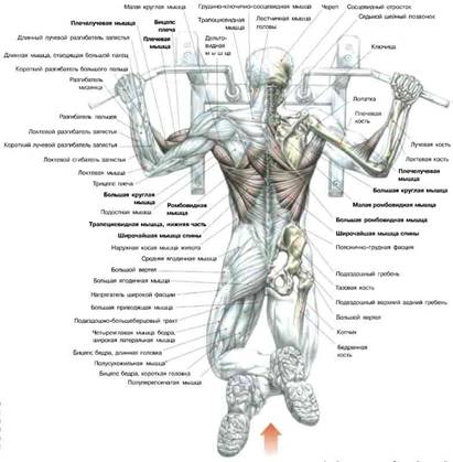 Подтягивания на перекладине -упражнение прекрасно подходит для развития широчайшей мышцы спины, большой круглой мышцы и, в момент сведения лопаток в конце подтягивания, ромбовидных мышц, а также средних и нижних частей трапециевидной мышцы. Оно задействует также бицепс плеча, плечевую мышцу и плечелучевую мышцу.