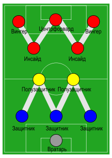 Классическая «пирамида» В 1883 году команда Кембриджского университета вышла на игру с двумя защитниками и тремя полузащитниками, перед которыми играло пять форвардов (2-3-5). Крайние полузащитники во время обороны следили за флангами, а средний играл ближе к нападению и часто становился одним из самых результативных игроков (например, Дьёрдь Шароши). В этой схеме средний нападающий оттягивался немного назад, создавая простор для фланговых игроков. Такую схему и применяли большинство ведущих команд в начале XX века (до 1930-х годов). Основные вариации: Итальянская система[править | править вики-текст] Отличалась особой ролью полусредних нападающих («инсайдов») — сразу после потери мяча они атаковали футболистов противника, становясь вместе с полузащитниками своеобразными «волнорезами» на дороге противника. Три форварда играли на острие: два крайних и центральный. Как правило, это были быстрые, жёсткие игроки с сильным и точным ударом (Сильвио Пиола,Раймундо Орси).