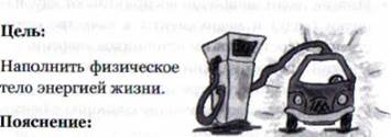 • Представьте свое тело в виде Светового Автомобиля. • Ощутите, что ваша жизненная энергия ослаблена. • Представьте, что вы въезжаете на Светозаправочную Станцию. • Протяните электрический провод от зарядного устройства станции к своей Световой батарее. • Визуализируйте ваш Световой Автомобиль полностью заправленным энергией жизни и жизнестойкостью. • Почувствуйте свое тело подзаряженным, здоровым и счастливым. • Вы полны жизни и готовы двигаться дальше.