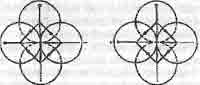 Рис. 9.2. Левый и правый тетрамеры воды (проекция на плоскость). Большие круги - ионы кислорода, черные точки - протоны, сплошные линии - протонные водородные связи, точечные линии - электронные