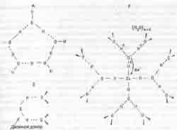 Естественно, возник вопрос, не могут ли атомы неорганических примесей в воде играть какую-то роль при "полимеризации" ассоциатов (Н20)п, называемых еще кластерами, когда они образуют структуры типа многоугольников с числом сторон n до ста. Кластер (см. рис. 9.4 а) при электронных возбуждениях ведет себя как единое целое, а при отщеплении электрона ионизируется или вступает в химическую связь [155]. В [156] методами ИК- и KP-спектроскопии было выявлено, что кластеры при n > 6 уже не имеют кольцевой структуры и обладают 0-Н-связью, которая является двойным донором протонов (рис. 9.4 б). В [156] ее назвали двойной?-водородной связью. Эта связь очень активна, и посредством ее кластеры с n? 6 могут вступать в различные соединения, образуя молекулярные комплексы, в том числе с примесными атомами, имеющими незаполненные орбитали V -типа. Авторы работы [146] указывают, что при образовании ККВ, основным методом получения которой является конденсация недонасыщенных паров воды на поверхности свежевытянутых кварцевых капилляров в вакууме [152], происходит "выщелачивание" водой из кварца атомов кремния. Они, взаимодействуя с кластерами (Н20)п>6, образуют молекулярные комплексы Si-(H20)n, один из которых изображен на рис. 9-4 s. Предполагается, что при этом происходит перенос электронной плотности с О -Н -связи, являющейся двойным донором, на свободную орбиталь атома кремния. В результате осуществляется семипольная (одноэлектронная) связь и образуется сильный комплекс с переносом заряда. При этом свободная орбиталь атома кремния выступает в качестве акцептора. В [146] показано, что энергия связи таких комплексов достигает 2,2 эВ на атом кремния. Действительно, потенциал ионизации кластера, определяемый энергией 0-Н -связей, составляет ~ 4 эВ [157], а энергия электронного сродства кремния -1,8 эВ [158]. Поэтому энергия связи комплекса получается как . Эта величина подтверждается и тем, что Ес можно вычислить как сумму энергий электронного сродства кремния и двойной водородной связи (2ЕН ~ 0,4 эВ), что снова дает . Понятно, что при образовании комплекса эта энергия выделятся путем излучения фотона. В [146] отмечается, что энергии фотона 2,2 эВ соответствует желтая область спектральных линий, и это объясняет желтоватую окраску капиллярной воды. Еще в [146] отмечается, что поскольку атом Si имеет четыре свободные орбитали, то он может одновременно вступать в связь с четырьмя кластерами. И при среднем значении числа молекул воды в кластере количество кремния, необходимое для образования ККВ, составляет 0,3-3 ат%, что приблизительно соответствует его содержанию в ККВ по данным анализов [153]. Все это великолепно согласуется с идеями Ю. А. Колясникова о роли кварца в формировании структуры воды, о которых мы говорили в предыдущем разделе. Только авторы работы [146] не учли, что кварц может формировать как право-, так и левовинтовые структуры. А потому и ККВ может быть как право-, так и левовинтовой. В [146] указывается, что роль соединяющего звена в системе кластеров воды могут выполнять не только атомы кремния, но и атомы ряда других неорганических веществ, например щелочных металлов. Но кремний предпочтительнее. Такая система "заполимеризовавшихся" кластеров обеспечивает ККВ не только повышенную плотность, но и в 10 - 15 раз большую, чем у обычной воды, вязкость. Температура замерзания ККВ снижается до 173 К, а темпер