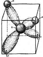 Рис. 11.4. Электронная модель молекулы Н20. Восемь электронов попарно вращаются по четырем орбиталям, расположенным в трех плоскостях (углы 90°), вписывающихся в куб: 1,2- неподеленные пары электронов [188].