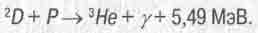Обсуждая результаты экспериментов по низкотемпературному ядерному синтезу, осуществляемых с использованием тяжелой воды, в первую очередь обычно рассматривают реакции (10.3) и (10.4) между дейтронами, подразумевая, что тяжелая вода имеет формулу D2О. Но тяжелая вода, получаемая обычными промышленными способами выделением ее из природных вод, состоит в основном из молекул ООН, так как в природных водах этих молекул в раз больше, чем молекул D2О [122]. Следовательно, в такой тяжелой воде столкновения атомов дейтерия с атомами протия происходят в раз чаще, чем с атомами дейтерия. А когда тяжелая вода еще и разбавлена обычной, то и того чаще. Поэтому в первую очередь следует рассматривать ядерную реакцию [6]: