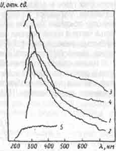 Рис.12.3. Спектры сонолюминестенции в воде, насыщенной различными газами: 1 - 500кГц, воздух; 2 - 16 кГц, воздух; 3 - 500 кГц, Хе; 4 - 6 кГц, Хе; 5 - воздух + 17% Хе при гидродинамической кавитации [202].