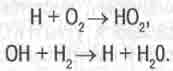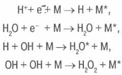 Так как рекомбинации ионов с электронами завершаются весьма быстро, то далее преобладают реакции рекомбинации радикалов H и ОН, а в присутствии кислорода - радикалов НО2.