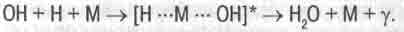 При рекомбинации радикалов H и ОН также происходит высвечивание энергии связи в виде фотонов с длиной волны - 300 нм. При этом присутствие инертных газов или солей приводит к тому, что рекомбинация идет уже посредством тройных столкновений с образованием на некоторое время "квазимолекулы" с третьей частицей (М) и последующим высвечиванием ею излучения в более длинноволновой (-400 нм) области спектра [202]: