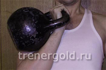 Упражнение – Поднятие гири на грудь. Поднятие гири на грудь – также вспомогательное упражнение. Но для начинающих очень ценное, так как оно позволяет почувствовать динамику подъема гири, ее фиксацию на груди.. И укрепляет как руку – кисть, предплечье, плечо, и ноги. Так как, подброс гири в положение на грудь осуществляется опять же ногами. Рука быстро устанет.