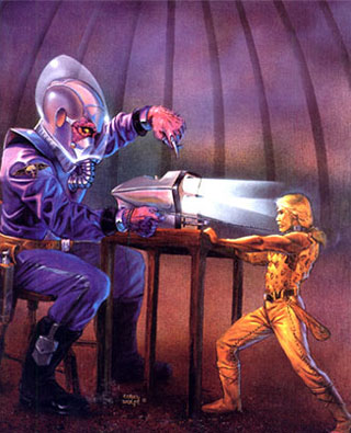 Терл знал много способов принуждения. Но сейчас был не тот случай, когда это могло возыметь действие. Человек понял, что в нем нуждаются, и постарается использовать это в своих интересах. Здесь придется быть очень осторожным и изобретательным. Терл сидел на стуле и вглядывался в незнакомое существо: может быть, у него тоже есть свои тайные замыслы? Может, оно рассчитывает на дополнительное вознаграждение? Может, Терл зря угождает ему, каждый день отлавливая свежих крыс и обеспечивая водой? Терл потратил столько времени, выясняя, чем питаются человекообразные, и вот, пожалуйста: этот отъевшийся задохлик стоит теперь перед ним и храбрится, заявляя, что все это он употреблять не будет. Терл присмотрелся внимательнее: да нет, и не храбрый он вовсе, и не отъевшийся. Скорее наоборот. Одежда совсем прохудилась, посинел от холода. Терл перевел взгляд на замерзший бассейн. Потом осмотрел клетку. Стало немного чище, видимо, пленник пробует наводить здесь порядок. – Животное, ты должно больше работать, и тебе будет лучше. – Зима, – заговорил Джонни, – плохо для машины. По ночам, в дождь и снег я укрываю ее шкурами, иначе она погибнет. Терл чуть было на рассмеялся: забавно, однако, слушать дикаря, говорящего по‑психлосски. У него такой смешной акцент, наверное, как у чинко. – Ты узнал слова, но, вероятно, не понимаешь их значения. Показать тебе, животное, как правильно? Джонни всегда опасался огромных мохнатых лап, а тут гордо вскинул голову: – Я человек, а не животное. Мое имя – Джонни. О, это уж слишком! Сейчас Терл проучит негодяя. Он ударил Джонни, и ошейник чуть не перерезал тому шею, когда веревка натянулась до предела. Потом выскочил из клетки и запер дверь. Когда он удалялся, земля ходила ходуном, как от землетрясения. Он почти дошел до комплекса, но вдруг, задумавшись, остановился. Оглядел серо‑белый пейзаж, ощутил обжигающий холодок стекла маски. Проклятая планета! Круто развернулся и пошел назад. Открыл дверь и склонился над человеком. Поднял его, обтер снегом кровь на шее и поставил перед собой на стол. – Мое имя – Терл. На чем мы остановились? Он прибег к уступчивости, в душе зная, что всегда будет обращаться с этим созданием как с животным. Психлос, в конце концов, не должен забывать, что он представляет доминирующую расу. Самую великую во всей Вселенной! А это так – выродок…