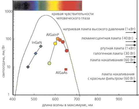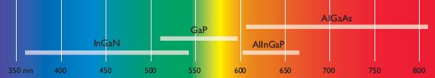 Основные материалы для производства монохромных светодиодов. AllnGaP и InGaN покрывают почти весь спектр видимого излучения для светодиодов высокой интенсивности, кроме желто-зеленой и желтой областей спектра с длиной волны 550–585 нанометров (нм). · Люминофорные технологии получения белого света предполагают использование одного светодиода коротко-волнового излучения, например, синего или ультрафиолетового, в комбинации с желтым люминофорным покрытием. Фотоны синего или ультрафиолетового излучения, генерируемые светодиодом, либо проходят через слой люминофора без изменения, либо преобразуются в нем в фотоны желтого света. Комбинация фотонов синего и желтого цвета создает белый свет.