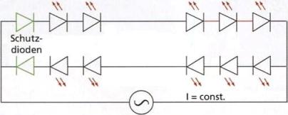 | Южнокорейская фирма Seoul Semiconductors интегрировала схему с двумя антипараллельными цепочками, (в каждой из которых большое количество светодиодов) непосредственно в одном чипе (“Acriche-LED”). Прямой ток светодиодов (20 мА) ограничивается омическим сопротивлением, подключенным последовательно к антипараллельной схеме. Прямое напряжение на каждом из светодиодов составляет 3,5 В.
