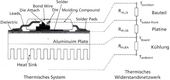 Схема светодиода с охлаждающим элементом и цепь его тепловых сопротивлений.