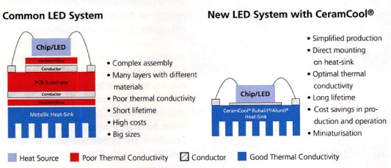 Фирма CeramTec применила для охлаждения светодиода керамический элемент CERAM COOL. Сравнение обычной конструкции (слева) с керамическим вариантом.