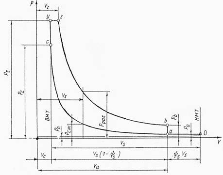 Цель расчета рабочего цикла – определение основных параметров рабочего процесса дизеля. Расчетный цикл базируется на относительно простом, но достаточно точном методе теплового расчета В.И.Гриневецкого – Е.К.Мазинга, разработанном в 1907 году в МВТУ им. Баумана, который позволяет определить расчетные значения параметров рабочего тела в характерных точках цикла, энергетические и экономические показатели работы двигателя. Расчетный цикл представляет собой совокупность пяти последовательно протекающих процессов: наполнение, сжатие, сгорание топлива, сгорание-расширение и выпуск. Основные расчетные формулы для каждого из перечисленных процессов получаются совместным решением уравнения состояния идеального газа, уравнений баланса энергии и массы. Процесс выпуска и его влияние на процесс наполнения в рамках данного метода расчета не рассматриваются. Расчет рабочего цикла заканчивается определением индикаторных показателей двигателя кроме мощности. Эффективные и геометрические характеристики двигателя от расчетного цикла не зависят. В этом заключается один из главных качественных недостатков метода В.И.Гриневецкого – Е.К.Мазинга, а именно, отсутствие зависимости между параметрами рабочего цикла и скоростью поршня. Графическое изображение расчетного цикла в рабочих координатах (рис. 1.1) называется диаграммой расчетного цикла. На этой диаграмме не отображаются процессы газообмена (на диаграмме четырехтактного двигателя отсутствуют такты газообмена, а на диаграмме двухтактного двигателя - «хвостовая» часть).