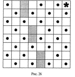 61. « Садовник ». Надо пройти так, как шел садовник (см. рис. 26). Он обошел по порядку все яблони (на рисунке — точки) и вернулся к исходной точке (*), ни разу не возвращаясь к одной и той же яблоне и пустым клеткам, не ходя по диагонали, не заходя на закрашенные клетки.