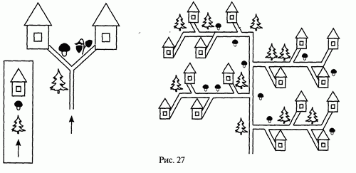62. « Полянки ». Ребенку предлагается рисунок « Полянки » и зашифрованное: письмо-схема, помогающее найти нужный домик. Используя схему, он должен найти домик, а затем объяснить, как схема помогла ему найти путь. Примеры представлены на рис. 27.