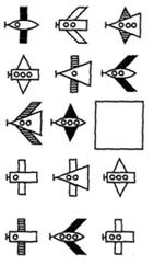 Предложите выполнить обратную задачу. Дается аналогичный рисунок, на котором надо найти домик по инструкции психолога, например: « Вверх, направо, направо вниз, налево вниз » и т. д. После этого ребенку надо нарисовать письмо-схему самостоятельно. 63. « Методы Равена и Айзенка ». Прекрасной тренировкой в умении устанавливать закономерности являются задания типа широко известных матриц Равена и тестов Айзенка (рис. 28): « Какой картинкой из нижнего ряда нужно заполнить пустующее место? »