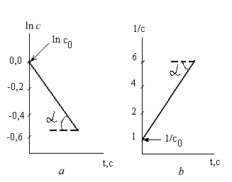 Размерность константы скорости реакции второго порядка [ k ] =[моль-1×л×с-1]. Константа скорости реакции второго порядка так же может быть графически определена из зависимости 1/ с = f(τ) (рис.10б), как