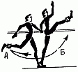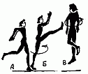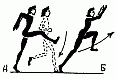 144. Выполнение активного отталкивания с наибольшим продвижением вперед, замах толчковой (А), активная постановка с быстрым выносом вперед маховой (Б), выпрямлением опорной в тазобедренном суставе, "отбрасывая" ее далеко назад, а колено маховой дальше вперед, то же с разбега.