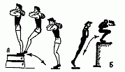159. Выпрыгивание вверх из положения толчковой ноги на повышенной опоре, то же с отягощением в руках.