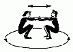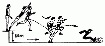 121. Прыжки на двух ногах вдвоем с опорой руками на плечи, поочередным давлением на плечи партнера.