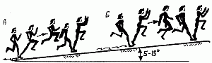 190. С 4-8 беговых шагов разбега прыжки с ноги на ногу -шаги (А), скачки (Б) на одной ноге по дорожке вверх: угол наклона до 15° - для шагов и до 5° для скачков.