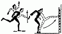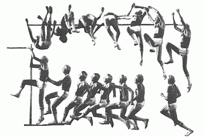 203. Действия прыгунов в высоту при отталкивании отличаются их направленностью - главным образом вверх и несколько вперед, как это демонстрирует первый чемпион мира Г.Авдеенко. Способ прыжка спиной к планке требует ускоренных действий в отталкивании. Это достигается быстрым и высоким на последних шагах разбегом, более далекой (чем в прыжках в длину) и плоской постановкой стопы толчковой ноги. Нога ставится активно с упругой фиксацией ее в тазобедренном и вынужденной незначительной амортизацией в коленном суставе в сочетании с быстрым выполнением маха согнутой в колене свободной ногой. Продольное вращение телу прыгуна придают как дугообразный разбег, так и быстрый мах ногой несколько внутрь от планки. Характерны энергичный мах двумя руками и вертикальное положение прыгуна в момент окончания отталкивания и в начале взлета. Во взлете плечи направляются к планке, поворачиваются к ней спиной, а маховая нога опускается. Над планкой делается активный прогиб, создается телом значительная дуга и таз поднимается. Как только тазовая область пойдет над планкой, выполняется группировка обратным сгибанием туловища, подниманием бедер, а затем подъемом коленей. Голова при этом несколько поднимается, а спина округляется. Приземление происходит на спину, для чего обязательна высокая амортизационная подушка.