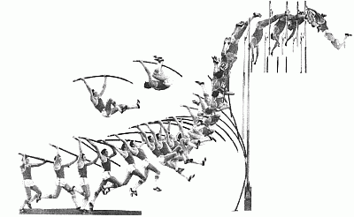204. В прыжке с шестом все части и движения связаны между собой определенным ритмом в единое, непрерывное решительное действие. Оно начинается с первых шагов разбега и плавно продолжается с опусканием шеста, отталкиванием, висом, взмахом, группировкой, разгибанием тела, подтягиванием, отжиманием, переходом через планку и приземлением.