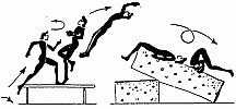 199. С 4-6 беговых шагов разбега по скамейке (тумбе) спрыгивание натолчковую ногу, прыжок на маховую и с приземлением в яму. Постепенно увеличивать скорость разбега и высоту места для разбега; то же, но после приземления натолчковую выполнить на ней скачок, затем прыжок на маховую - шаг и приземление на поролоновые маты.