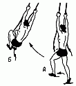239. С двух-трех шагов разбега раскачивание на двух канатах-кольцах толчком одной ноги (А) с последующим подтягиванием согнутых ног к груди (Б) и возвращение в каче назад в таком же положении.